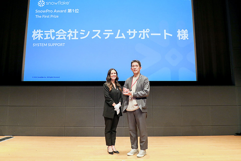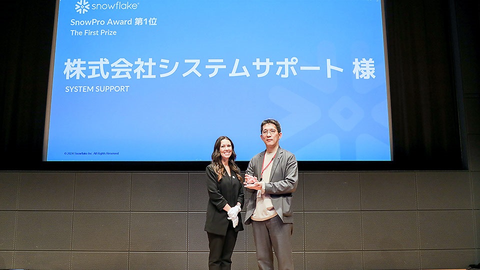 Snowflake社のパートナー表彰「The 1st SnowPro Award」で1位を獲得しました お知らせ 2024.03.26 システムサポート、Snowflakeのパートナー表彰において「The 1st SnowPro Award」1位を獲得同賞は、Snowflakeのデータクラウドの専門的な知識と開発運用技術に必要な技術力と専門知識を有することを証明する認定資格である「SnowPro」の育成に精力的に取り組んだSnowflakeパートナー企業に授与されるものです。