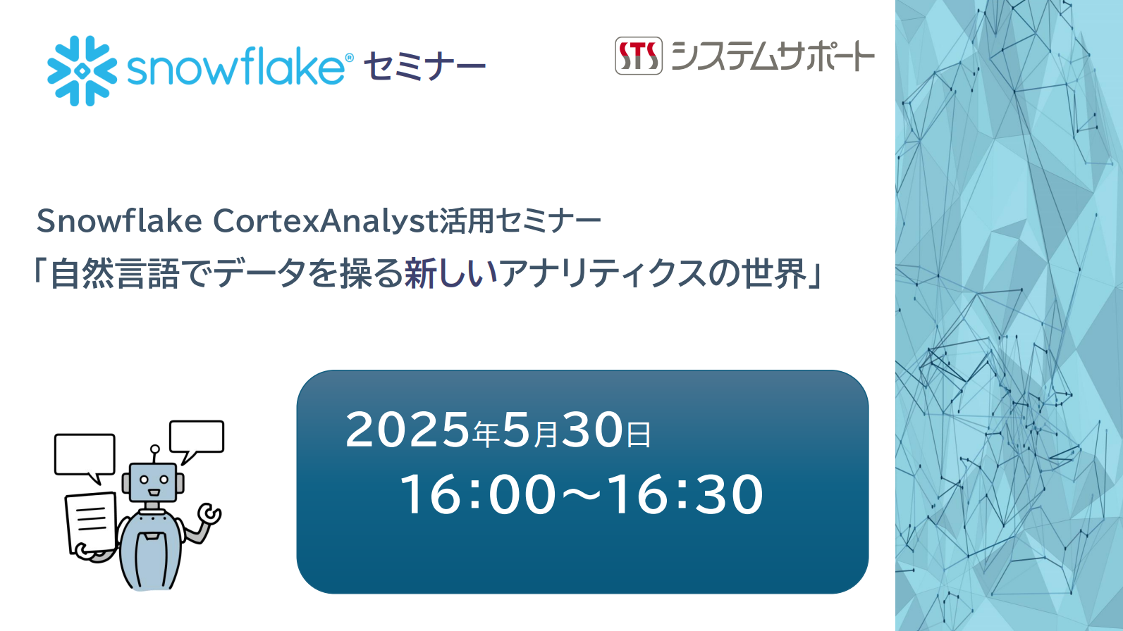 5/30開催オンラインセミナー「自然言語でデータを操る新しいアナリティクスの世界」 お知らせ 2025.05.22 Snowflake Cortex Analyst 活用セミナー 開催のお知らせ ~自然言語でデータを操る新しいアナリティクスの世界~今回のセミナーでは、Snowflake Cortex Analyst についての説明と、デモを交えながら自然言語でデータ分析を行う方法、ユースケースについて紹介します。 皆様のご参加をお待ちしております。